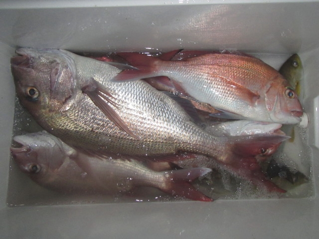 真鯛38cm~47cm4尾(40cm以上3尾)、イサキ25cm~35cm16尾、他にアヤメカサゴなど。