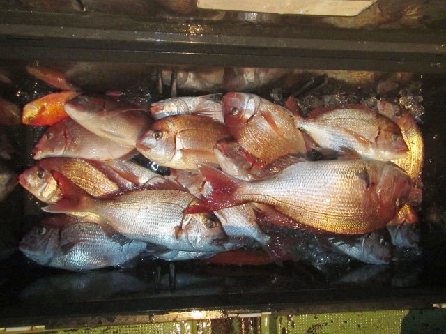 真鯛36cm~50cm2尾、良型チ鯛30cm~36cm15尾、他にシキシマハナダイなど。
