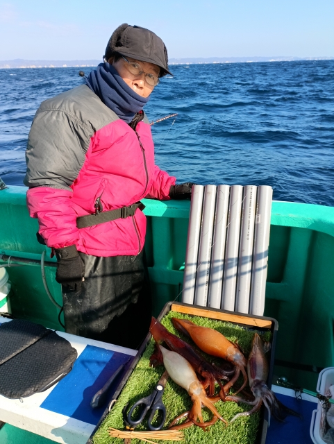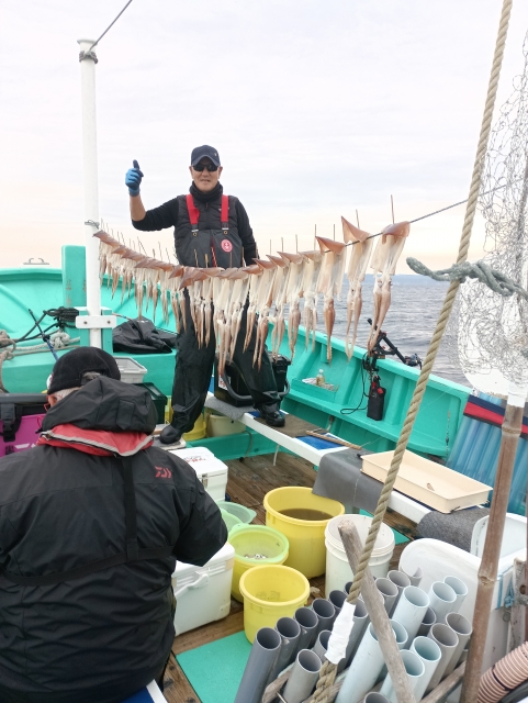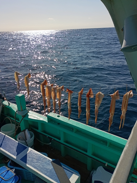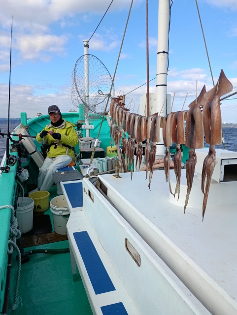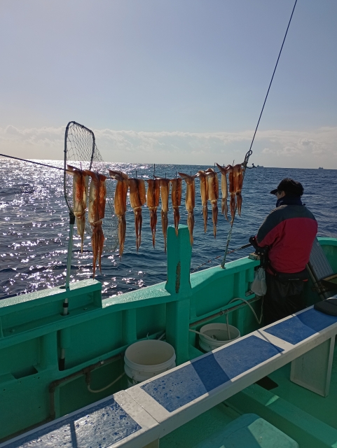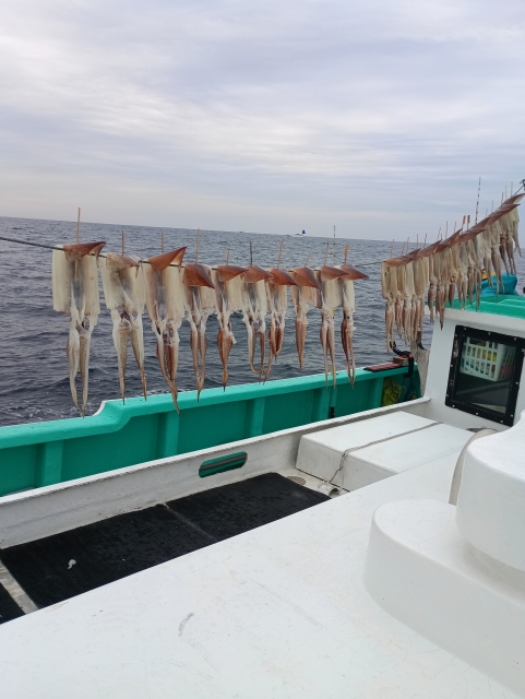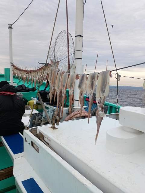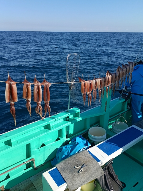 勝浦沖150~200mの漁場にて本日は底反応ありましたが、多少の二枚潮に水温低下のせいかスルメイカのノリ悪く1杯ずつ1杯ずつあがりましたが続かずでした。その後もたまに1杯あがる程度の拾いつりで沖上がりをむかえましたが反応ありますので潮海況によりノリ上がること期待します。明日も出船確定しておりますので引き続きの御予約お待ちしております。集合は川津港市場付近に5時になりますのでお気を付けてお越しくださいね。救命胴衣の着用義務化により必ずご用意お願いいたします。