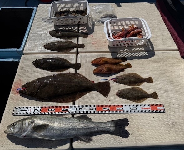 ヒラメ55cm・50cm~5匹・スズキ(90cm)・アコウ(2匹の釣果、