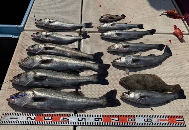 スズキ・ハクラ(11匹)・中ヒラメ・メバルの釣果、