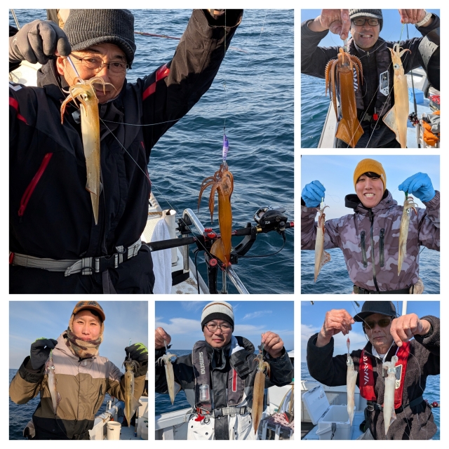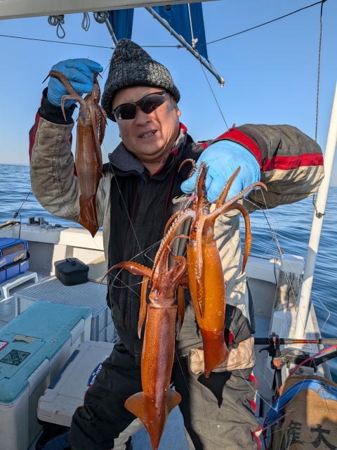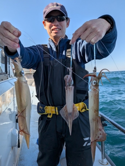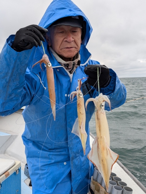 風波で釣りにくい状況でヤリイカは3点掛けが最高で単発が多く数は伸び悩み、ゲストのスルメイカも3点掛けが最高でケンサキイカはダブル迄で単発が多く渋い釣果でした。
