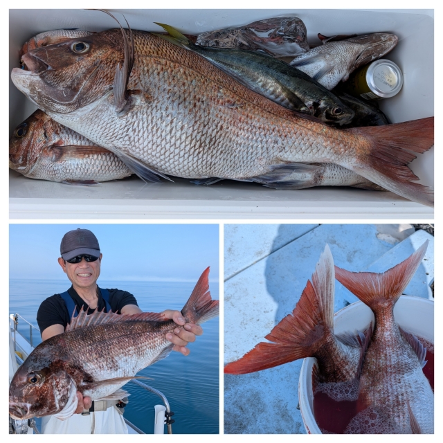 午後便のお客様 3名真鯛 46~63cm 5枚ブリ 83cm 1本ワラサ 65~75cm 7本その他 マトウ...