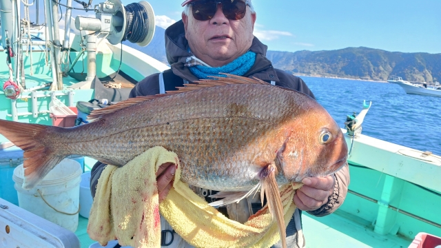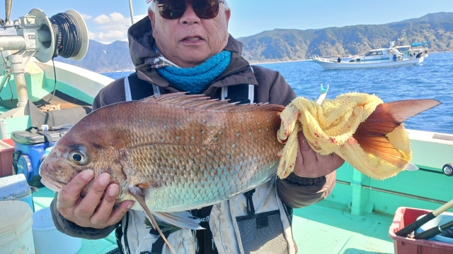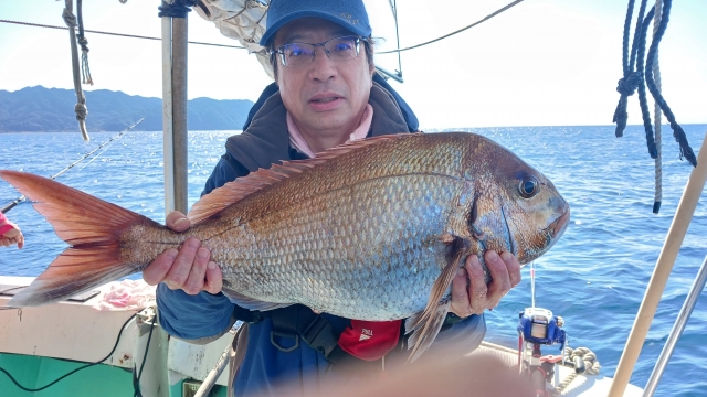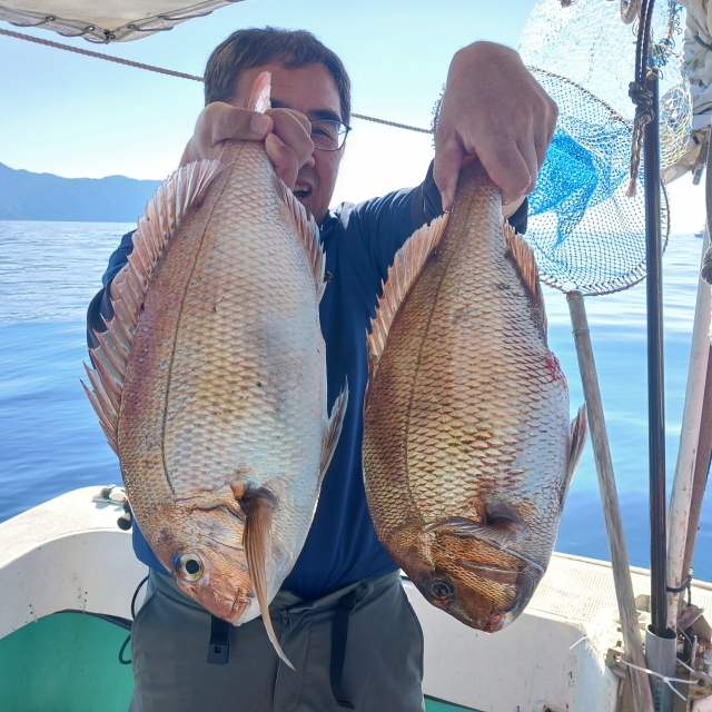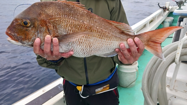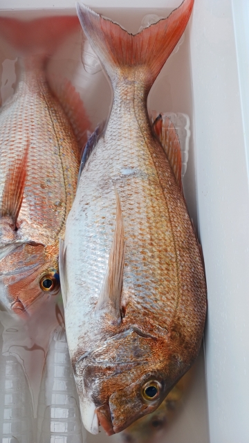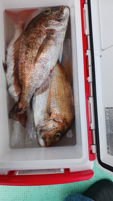今日は波が少々高い中、ご覧の良型の真鯛などでした。