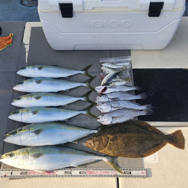 大物狙いでは、短い時合にブリ・メジロ・ヒラメと釣って頂く事ができ、青物も全員安打して頂く事ができました