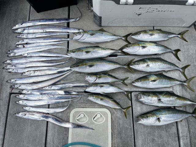 チャーター便で、大物&太刀魚&アジ狙いで出船させて頂きました。大物狙いは前半と後半に小アジノマセとジギングで...