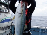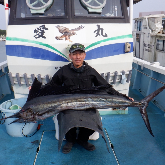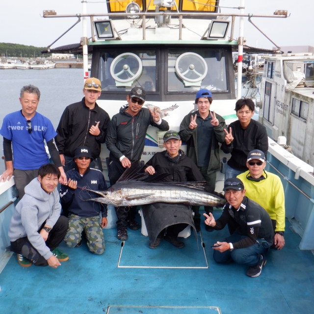 この日はPE3号リーダー14号のジグの仕掛けが、5人が5人ともプツリと不意に切られるまたは、急に走り出してドラグをゆるめても切られるという事態が多発して、何か正体がわからずに、沖サワラかサワラか何かと思案していたら、ついに姿を現したのは、2m前後のバショウカジキでした。