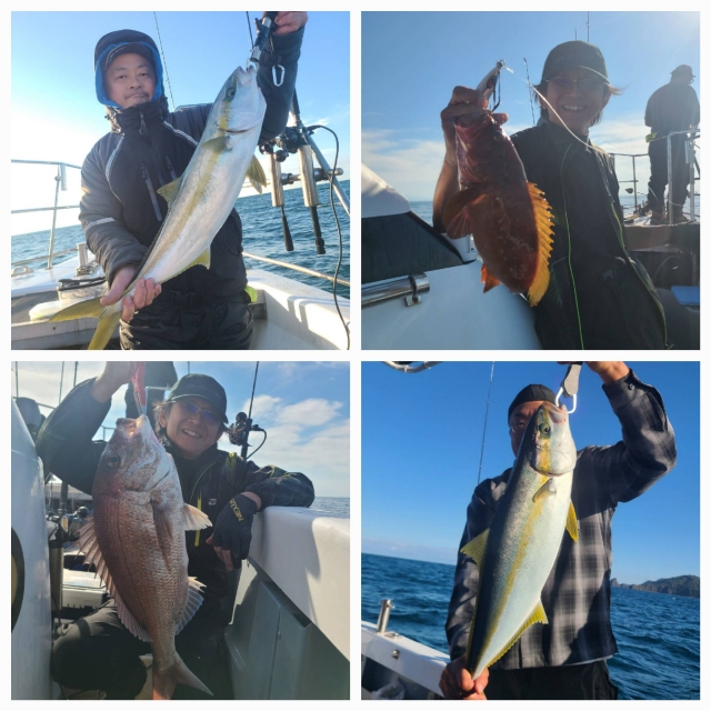 午後便のお客様 3名ヒラマサ 70〜75cm 4本真鯛 40〜66cm 7枚ハマチ ワラサ 60〜71cm ...