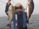 京都市の名古さん3名。真鯛37cm~43cm4尾、ブリ95cm、イサキ30cm~38cm36尾、他に真フグな...