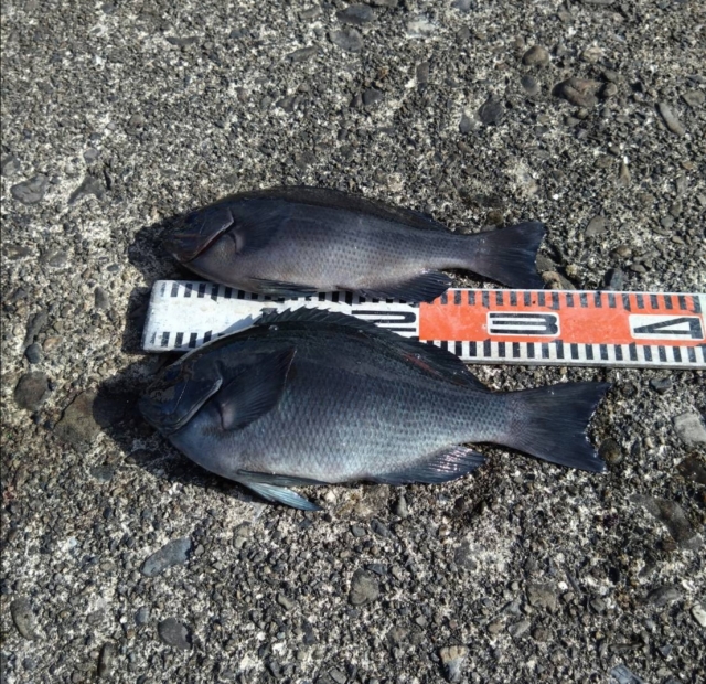 大石磯にて、口太グレ33、35cmを各1匹釣り上げました。