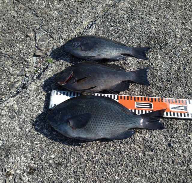 オザキ磯にて、口太グレ31~34cmを3匹釣り上げました。
