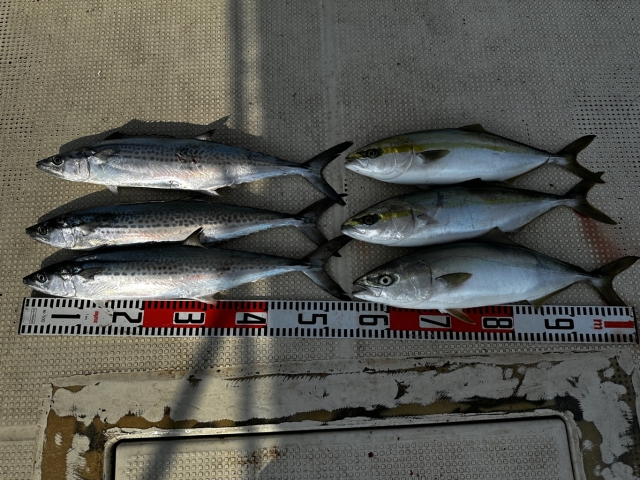 【コメント】5名様ジギングで出船。早朝より青物の潮が来るまでタイラバでしたが、顔見れずそこからジギングでサゴシ3匹ほかハマチ3匹。内訳は、竿頭サゴシ2匹にハマチ1匹、サゴシ1匹+ハマチ1匹+ハマチ1匹など、お一人だけ釣れす全員安打にはならず残念です皆様お疲れ様でした。