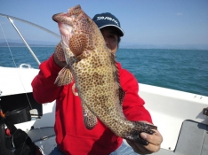 条鰭綱のスズキ目、ハタ科、ハタ亜科、マハタ属に属するオオモンハタ。本州南部~四国、九州からインド、西太平洋域に広く分布し、沿岸の砂地混じりの岩礁帯、または珊瑚礁に生息している。最大50cmほどになり、ハタ類の中では比較的小型の種類。