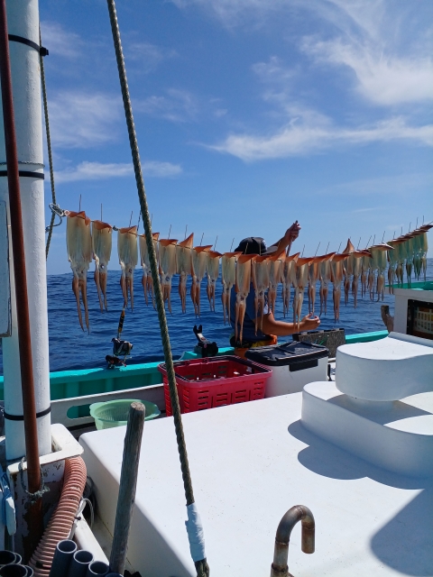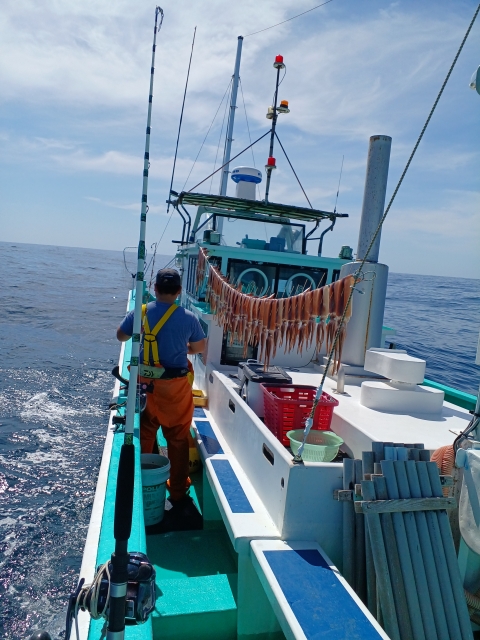 勝浦沖140~180mの行程35分の漁場にて本日は潮流れて二枚潮入り糸ふけ出やすく海上はウネリ高くスルメイカのノリは今一つでした。皆様、ブランコ仕掛けにて対応して大中型スルメイカが1杯ずつですがポツリ、ポツリとあがり皆様お土産となりました。今後もスルメイカ乗合出船致しますので引き続きの御予約お待ちしております。乗合は常時8人限定で釣座間隔4m確保し、おまつり軽減で一人より出船致しますのでお気軽に御予約下さいませ。集合は川津港市場付近に4時20分になりますのでお気をつけてお越しくださいね。救命胴衣の着用義務化により必ずご用意お願いいたします。