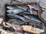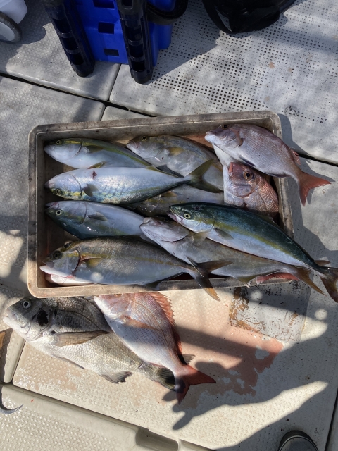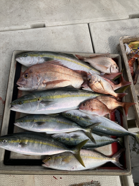 4名様で、ジギングではネリゴ、ヤズ、ハガツオ、落とし込みでブリ、ヤズ、チヌ、鯛ラバで500g~1キロの鯛でした。
