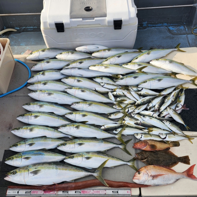 大物狙いは小アジノマセでチャレンジして頂き、時合にはメジロ・ハマチ・サワラ・ヒラメと釣って頂く事ができました 後半はじっくりヒラメ狙いをして頂きましたが今日はヒラメの活性が低めで、ヒラメの顔は見せて頂けましたが数伸びずでした。