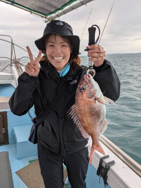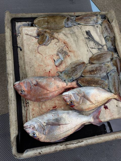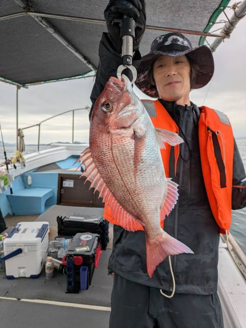 本日はテンヤ仕掛けです。前半当たり少な目徐々に当たりが出ました、しかし、今回、根掛かり多発、!!瀬の荒いところや、起伏の激しいポイントを流してはいないが、何故か多く釣果に影響大根掛かりしないポイント選びを優先しました。鯛数少な目でしたが、60cmが上がり、アコウも型がよく良かったです。根掛かりが少ないならもっと期待出来たかな?と思いました。