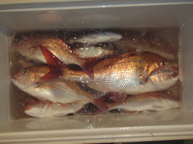 真鯛38cm~47cm4尾(40cm以上3尾)、イサキ25cm~35cm16尾、他にアヤメカサゴなど。